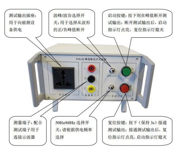FMD-02峰值斷電裝置可使被測設備與電網電壓在峰值時斷開,且其斷開電路后的絕緣電阻足夠大(DC500V條件下≥100MΩ),以此來模擬拔斷插頭的方法。可用于家用電器、音視頻設備、醫療器械、燈具、信息技術設備等電氣設備插頭放電和剩余電壓測試。由于該裝置可以精確的保證在“峰值”斷電,因此通過與示波器配合使用,可以精確地測得放電電壓的最大值。